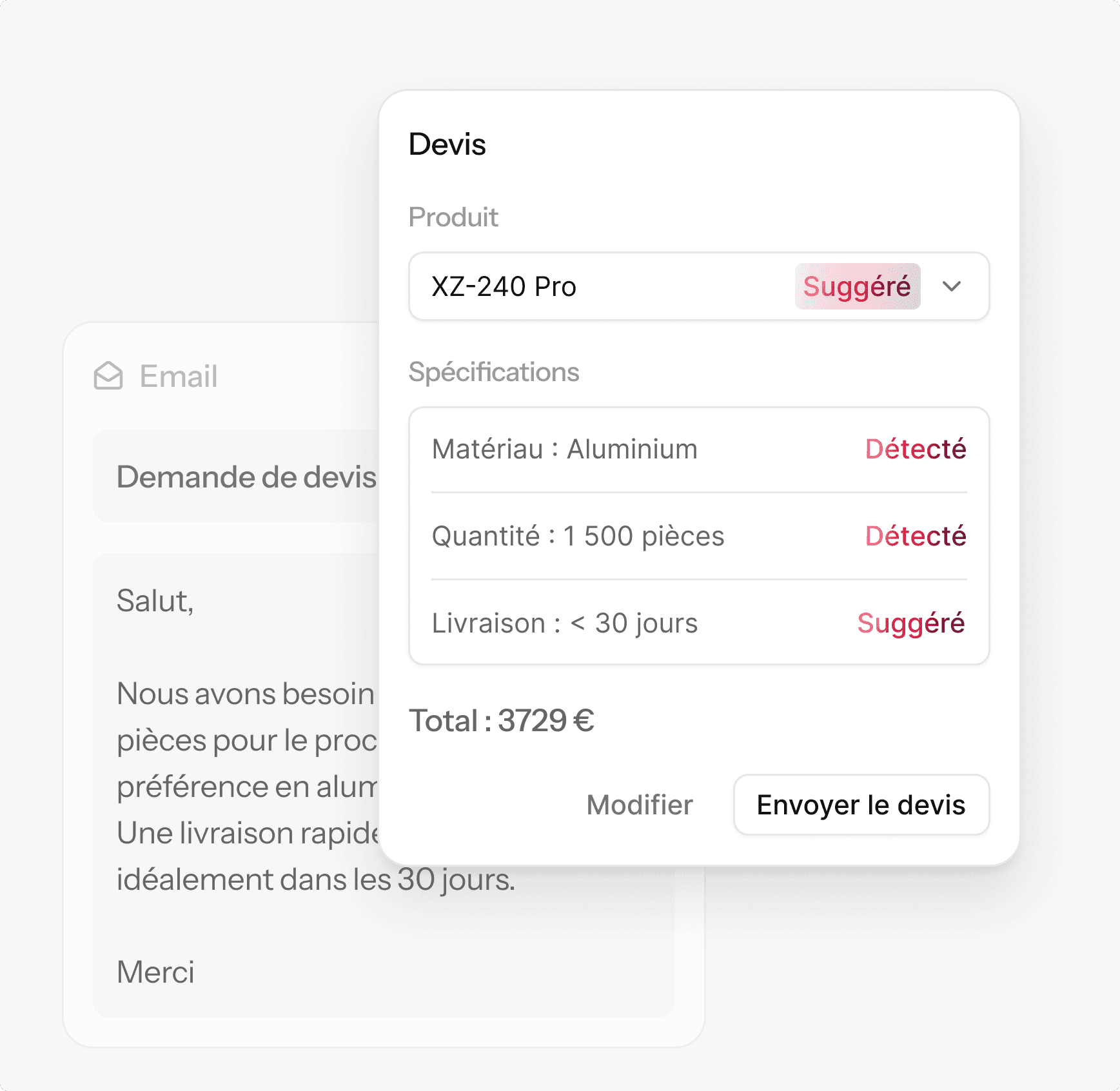 Lit la demande, extrait les spécifications, consulte le catalogue et génère un devis prêt à envoyer.