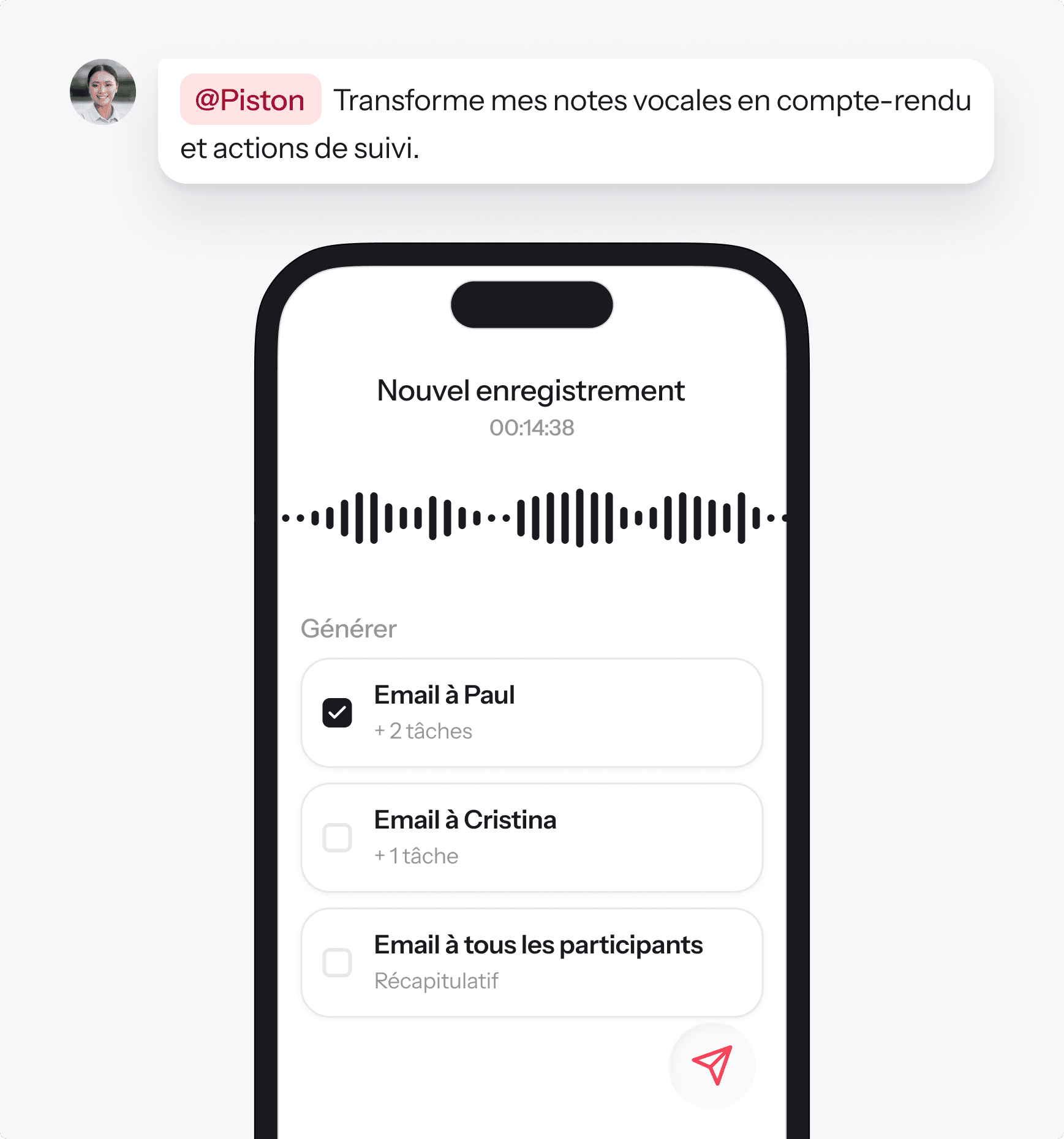 Transforme vos notes vocales en synthèses structurées, emails et tâches vous ne perdez plus rien.